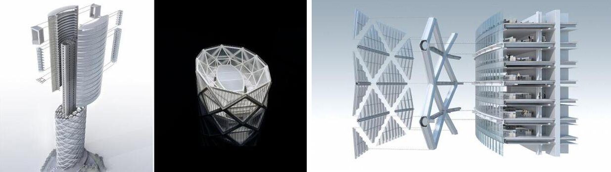 建筑方案由美国SOM公司设计。其中T1楼按建筑结构采用钢管混凝土柱交叉网格外筒和钢筋混凝土内筒组成的筒中筒结构,外框筒由约45°角交叉编织的钢管混凝土斜网格和水平环梁组成,总体钢结构用量超过1万吨。全楼竖向无柱设计,内外框筒间每两层相连,楼盖隔层悬吊;大堂主入口上方127米的通高中庭效果震撼,但造成各层平面结构不连续;中庭顶部有6层高旋转楼梯悬挑跨度10米;结构平面、竖向均不规则。处处都充满建筑独特趣味,同时也是对结构的巨大挑战。