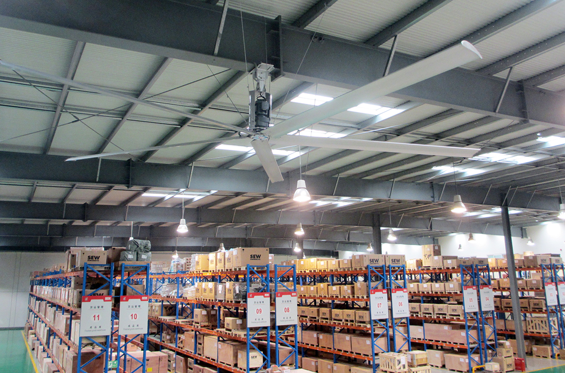 风扇,家家都有,原理简单,可重达127公斤、直径7米多的工业大风扇,依旧令人震撼:一是如此庞然大物,它的功率仅为1.5千瓦,一小时耗电比一台家用空调还少;二是一台工业大风扇转速仅为50转/分钟,转速虽慢,风量可不小,可覆盖面积2000平方米。